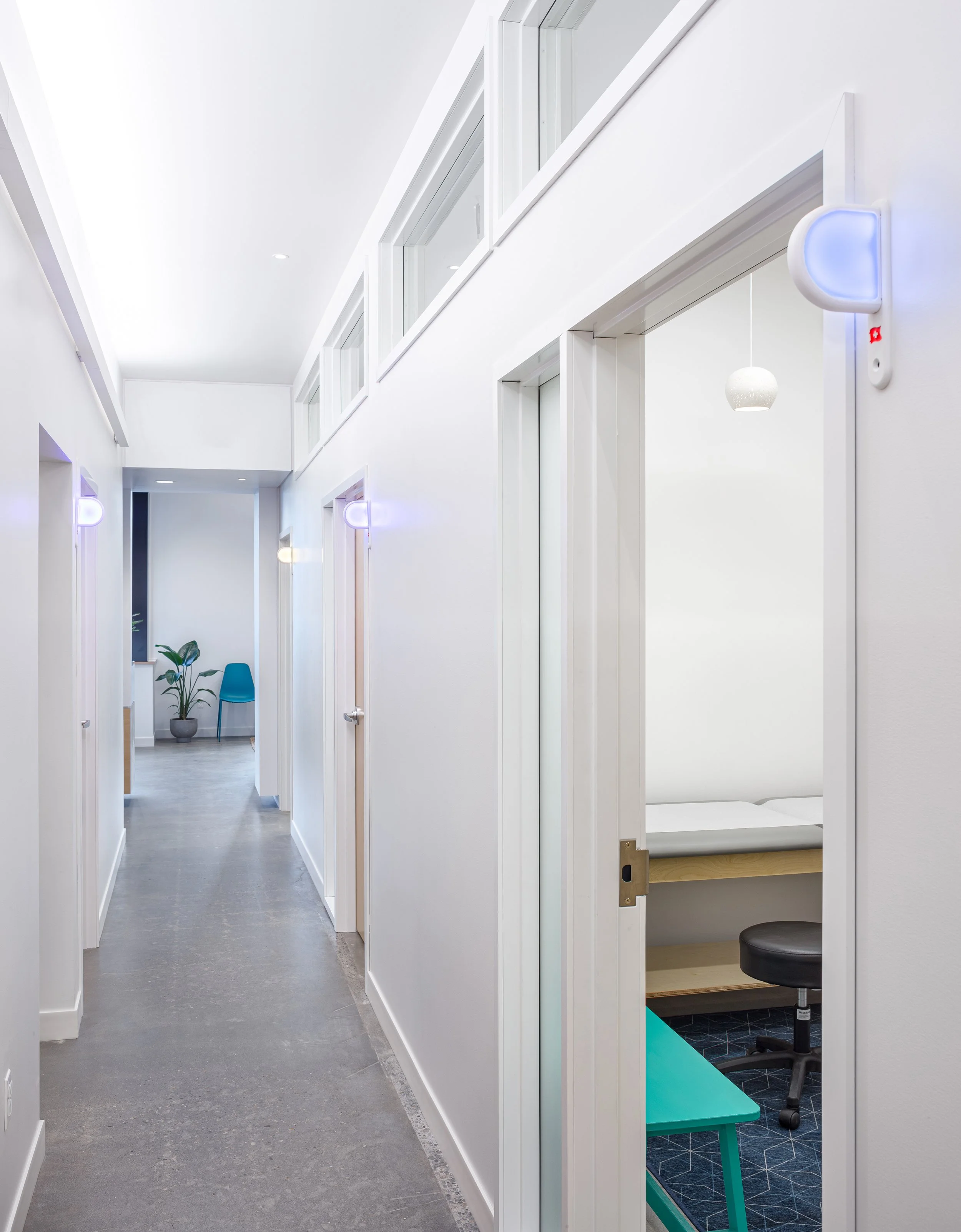 The space balances modern design with a playful spirit—concrete floors, lofted ceilings, and colorful light fixtures create an inviting, child-friendly environment. Full-height glass opens the lobby to a community room, filling the space with natural light, while cleanable finishes and thoughtful casework support staff needs and clinical workflows.