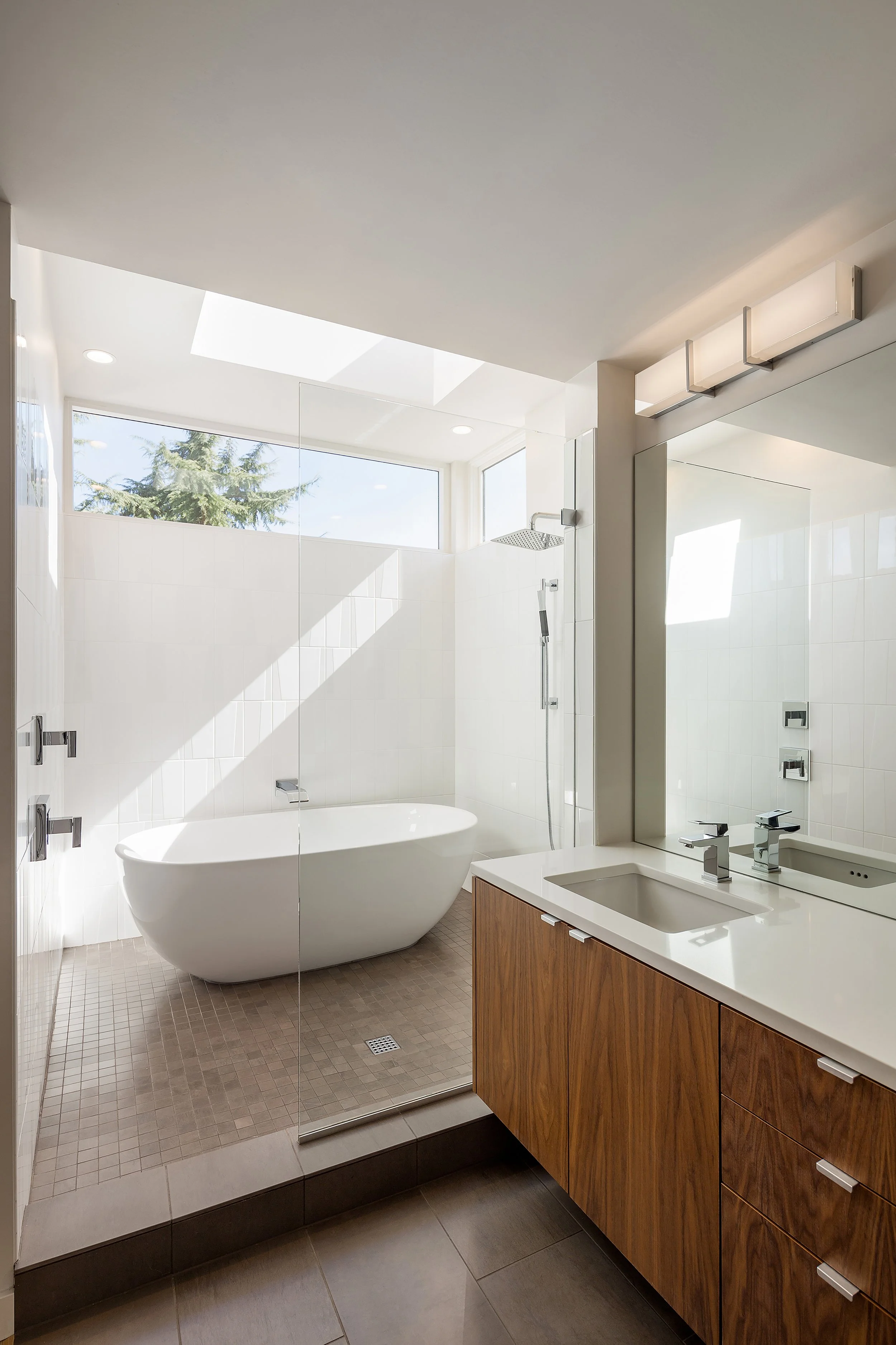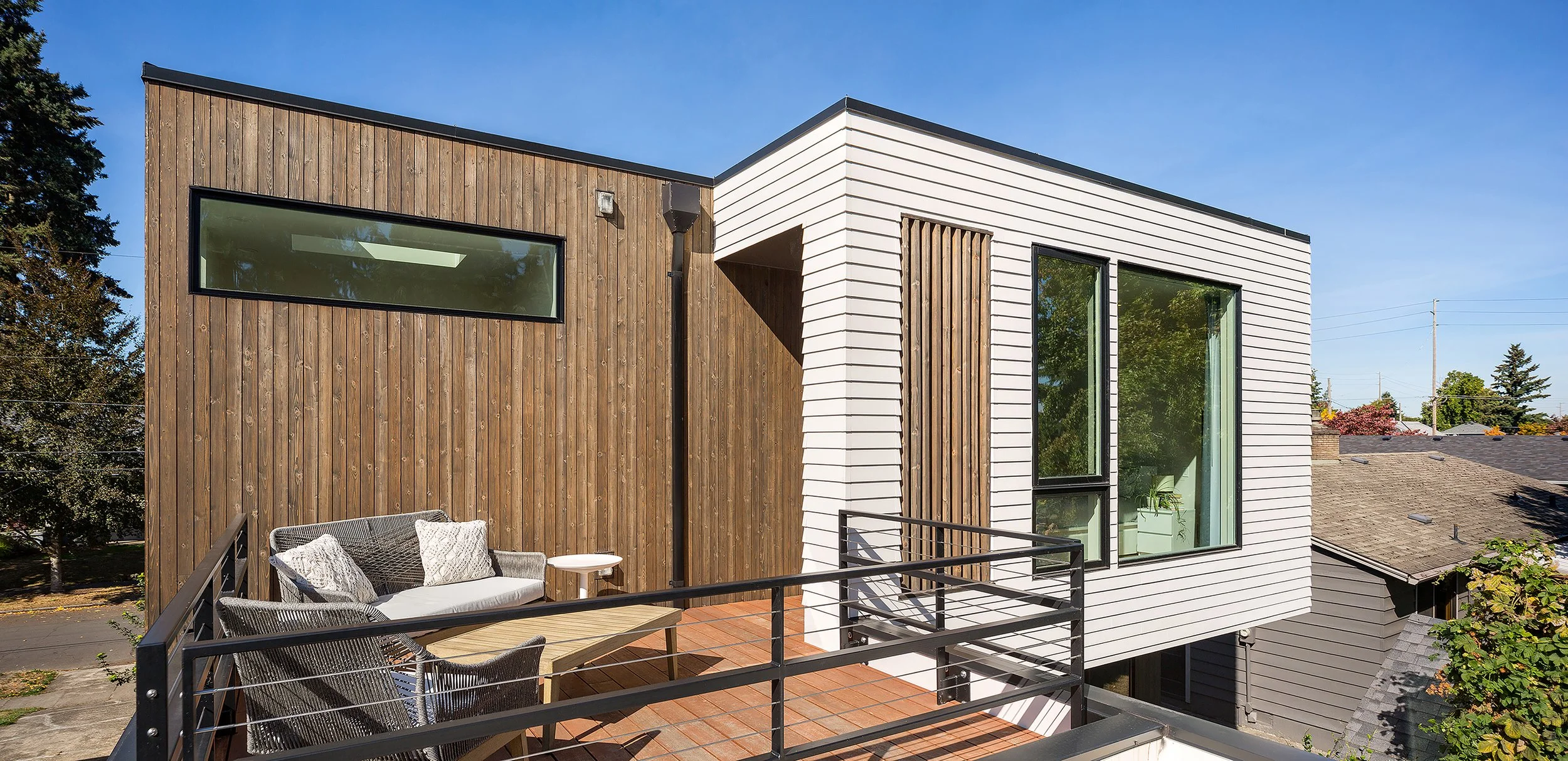 SUM reimagined it as a bold, light-filled urban home that honors its origins while embracing modern living. Portions of the original foundation and site were preserved, giving rise to a new two-story form clad in natural cedar, vertical siding, and crisp white finishes. Large, strategically placed windows draw light deep into the home, while a recessed entry and layered landscaping balance openness and privacy.