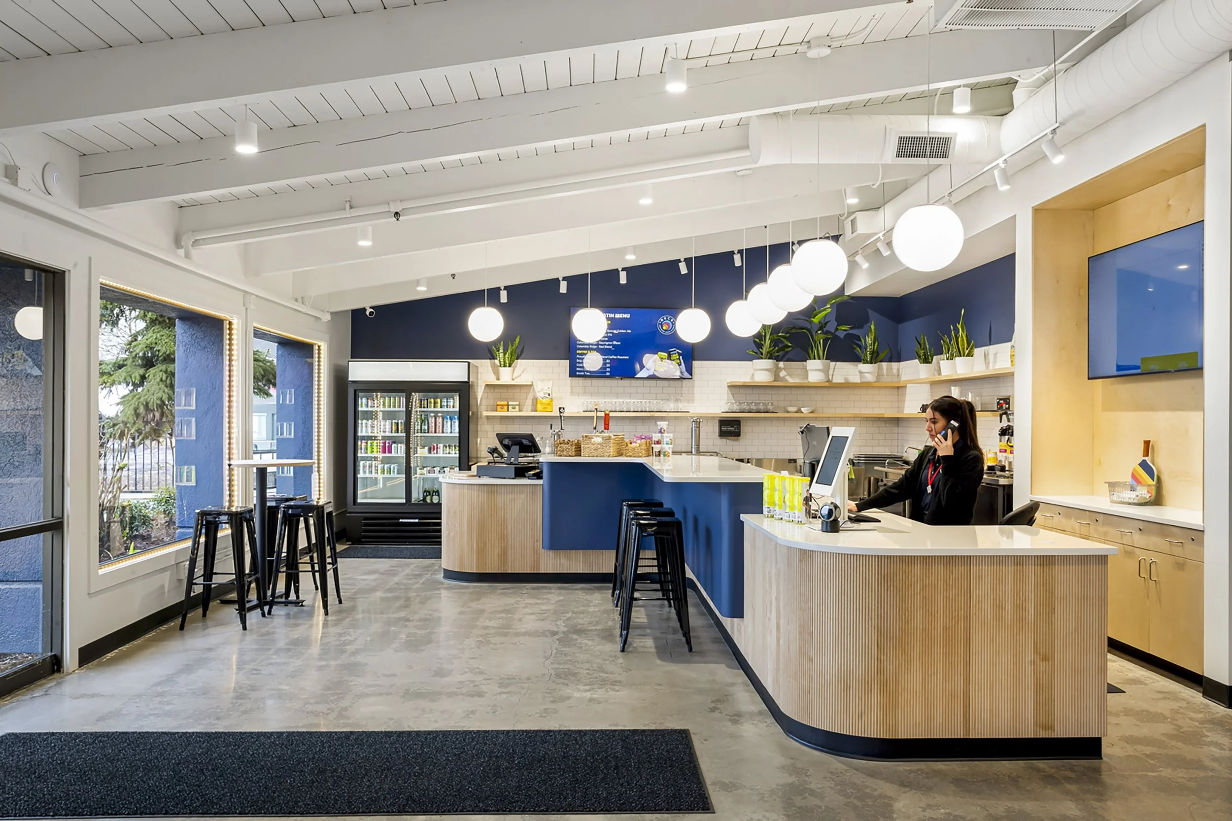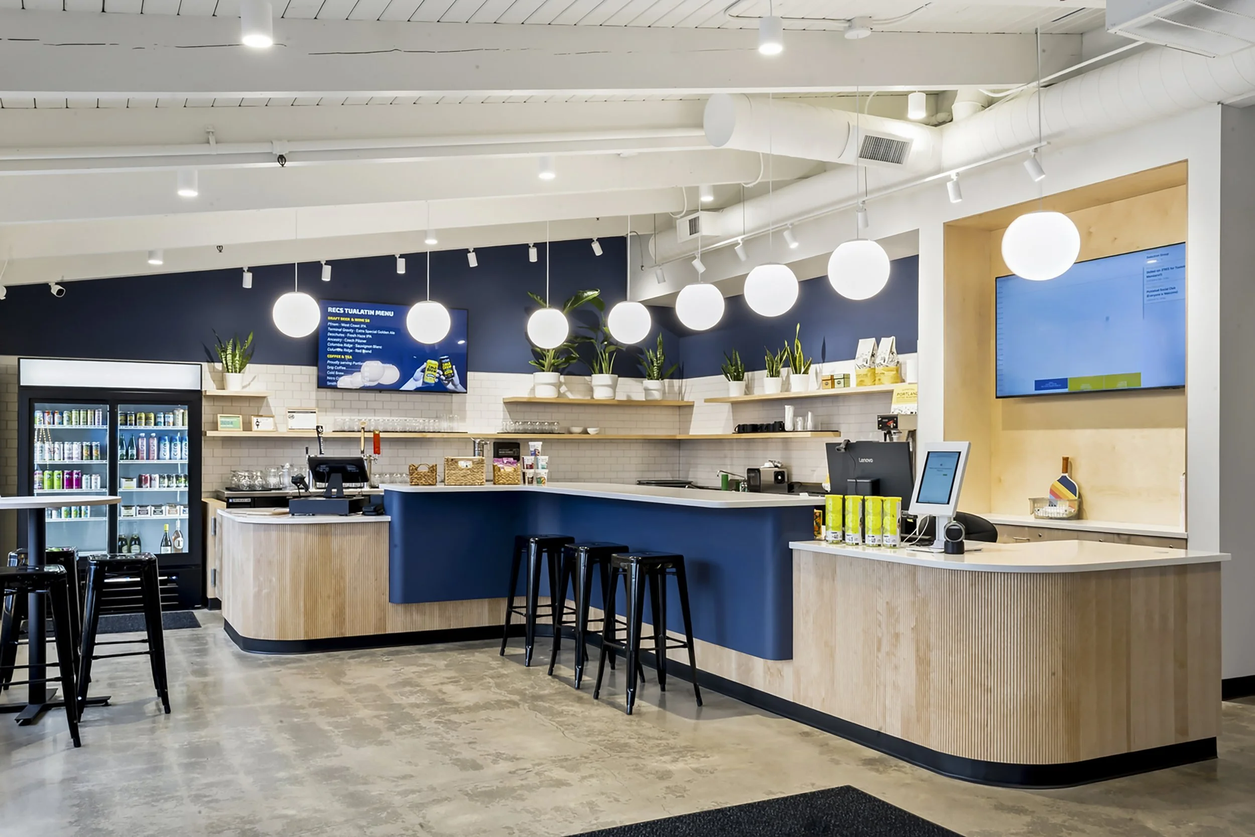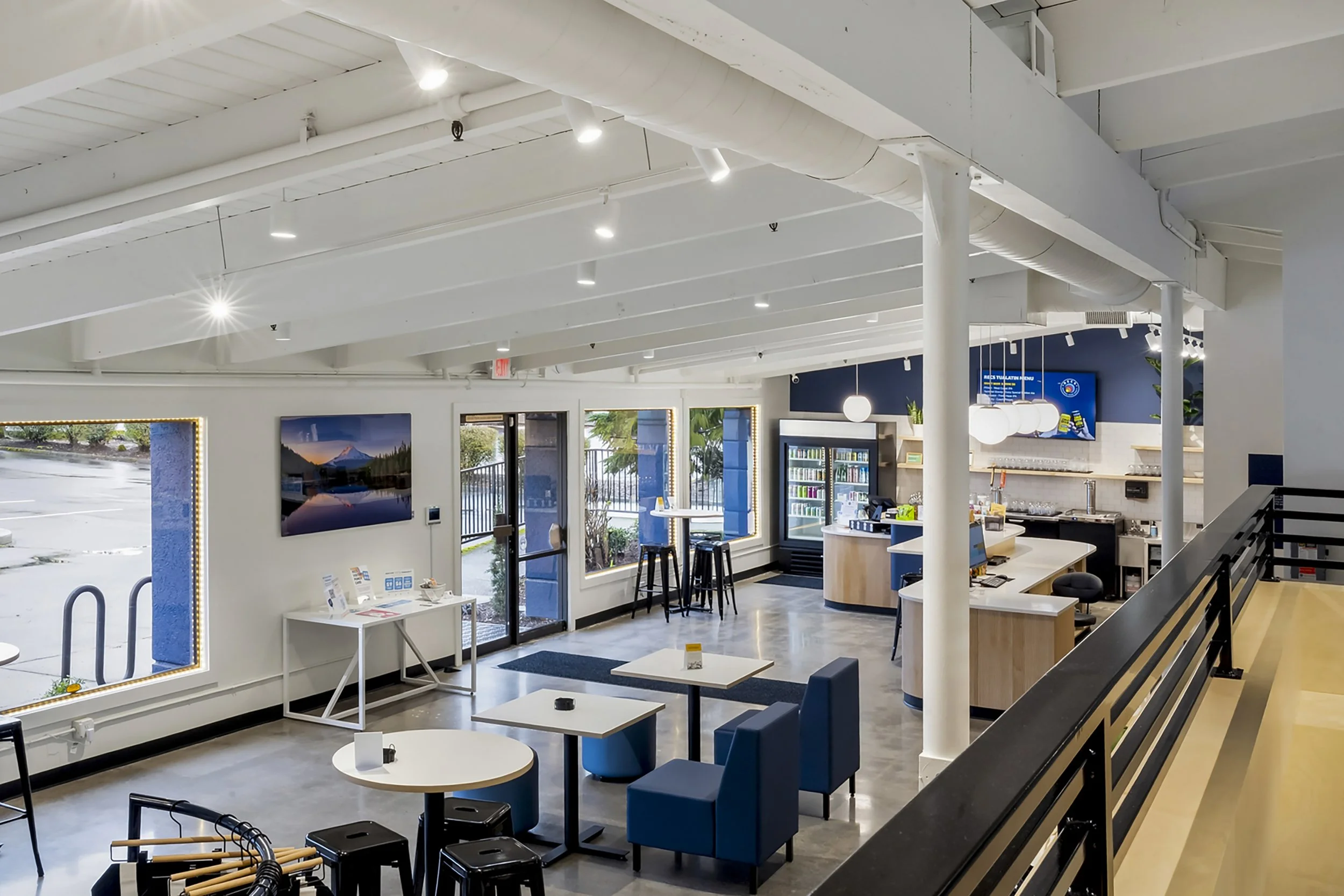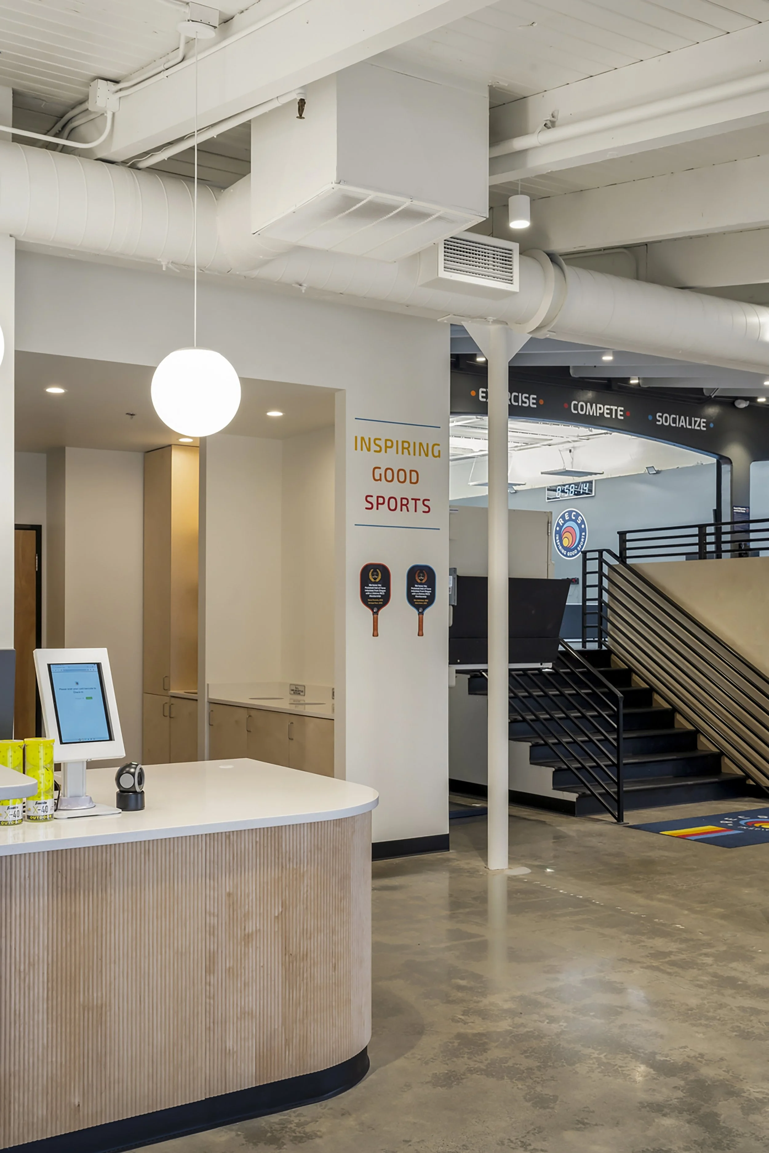 The interior replaces industrial coldness with a warm palette of natural woods and vibrant, brand-inspired accents. The result is an energetic, welcoming environment that brings the RECS mission to life: Recreate, Exercise, Compete, and Socialize.